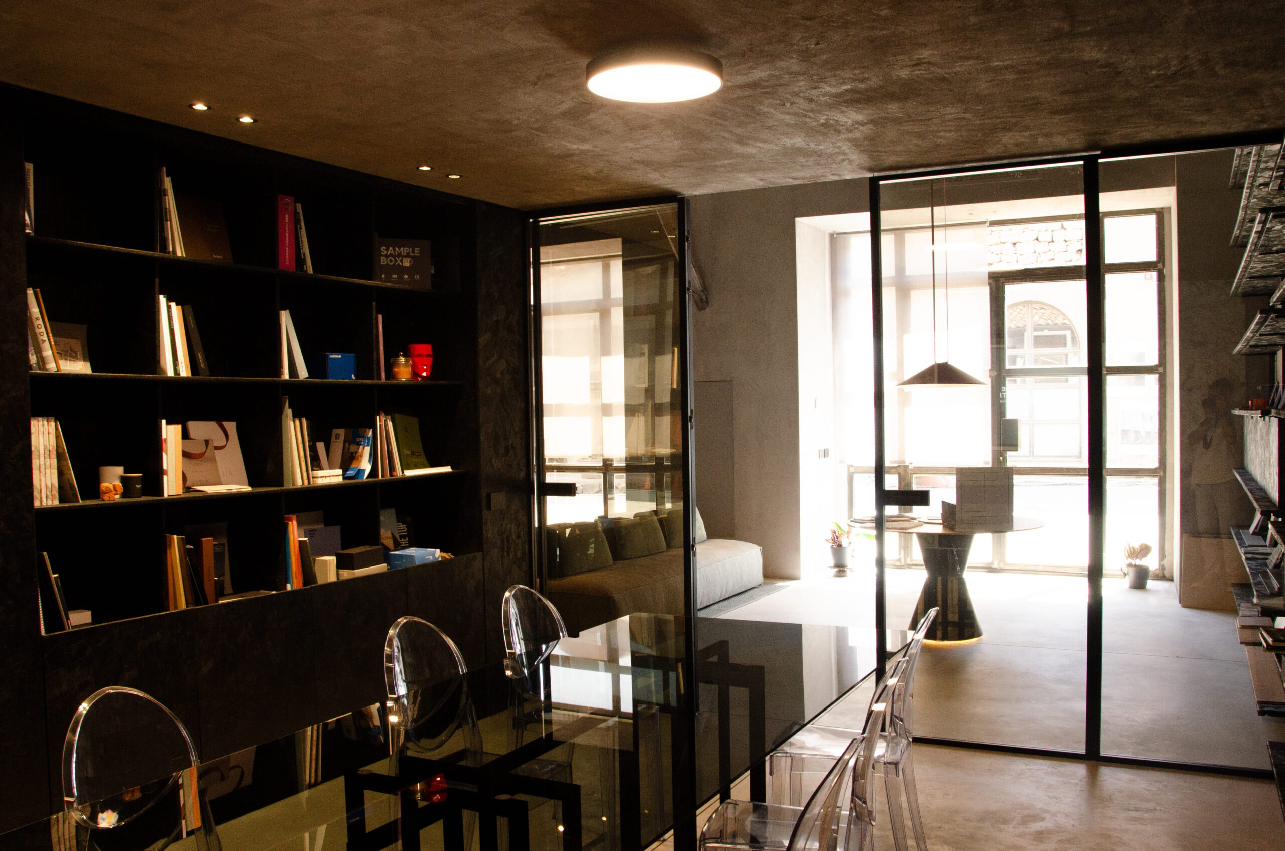 Appena varcata la soglia di ingresso si è subito colpiti da una imponente materio teca a tutta altezza che raggiunge l’area soppalcata ed entra all’interno della sala riunioni trasformandosi in libreria contenitiva.