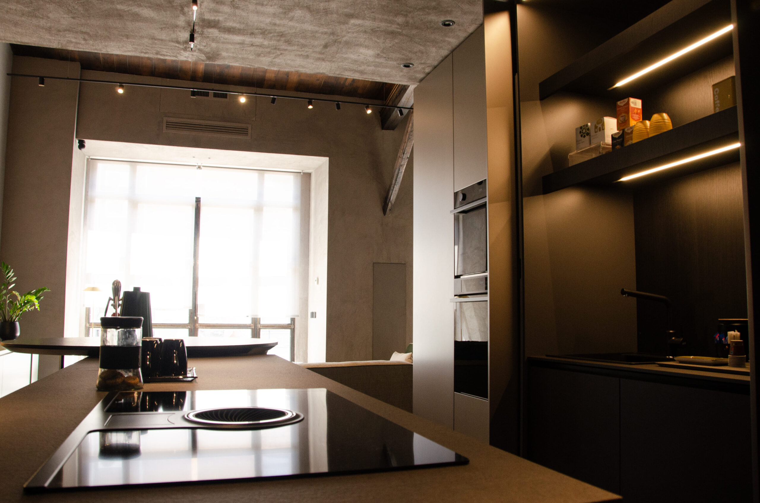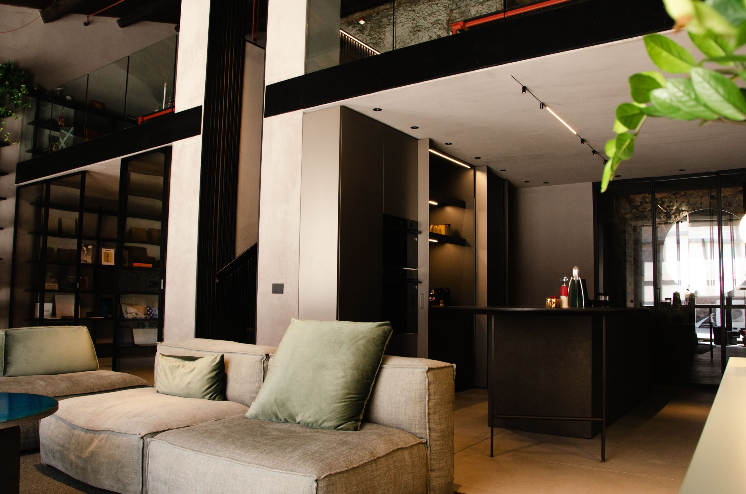 Lo spazio, che aveva già una sua identità non è stato stravolto ma, attraverso l’utilizzo di materiali naturali come l’intonaco a calce naturale per le pareti e i controsoffitti, del legno di rovere per le boiserie e per gli arredi, unitamente al pavimento in cemento esistente, al ferro degli infissi e delle struttura portante a vista come del tetto in legno scuro, abbiamo voluto enfatizzare il concept industrial che già lo caratterizzava.